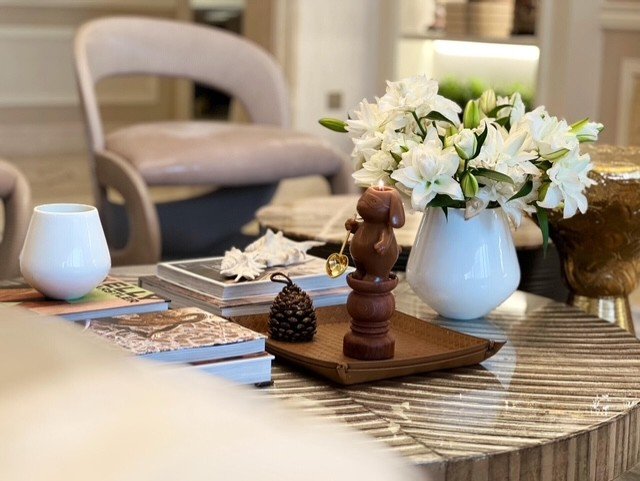 - How to do it: Choose a beautiful tray (made of wood, metal, rattan, or lacquer) as your foundation. Place a small stack of 2-3 coffee table books on it. Lean them or stack them neatly. Next, top the books with a small object, like a decorative box or a petite vase. Finally, add a medium-sized candle or a small potted plant (like an orchid or succulent) beside the books.